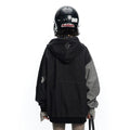 This women's hooded denim jacket features a trendy irregular stitching design with stylish color matching in shadow gray. The unique dark series line stick pockets add a modern, edgy vibe, enhancing its urban appeal.