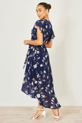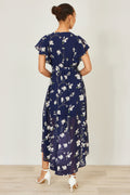 Yumi Navy Floral Wrap Midi Dress With Frill Hem